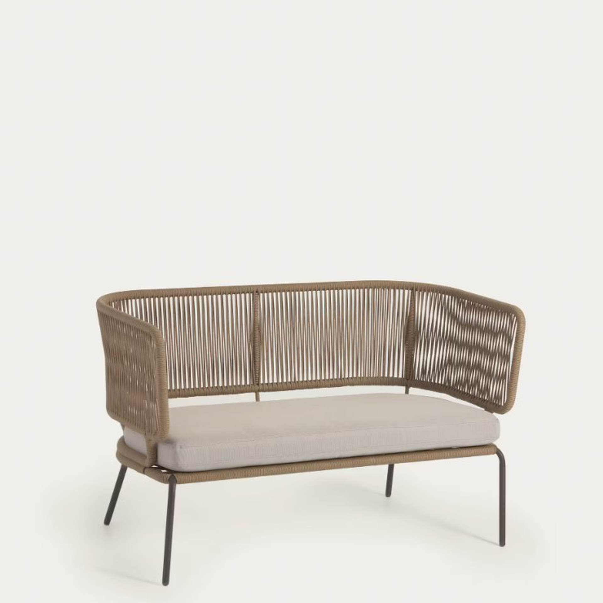 Sofá de 2 plazas con estructura de acero galvanizado y respaldo de cuerda. Respaldo artesanal. El trenzado de la cuerda está hecho a mano. Estructura de acero galvanizado resistente a la oxidación, a la corrosión y a los rayos UV. Apto para uso interior o en exteriores.